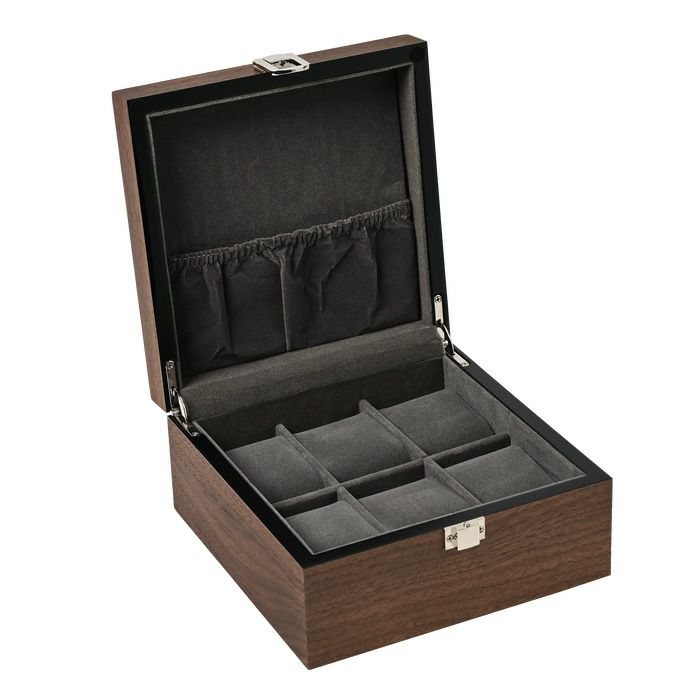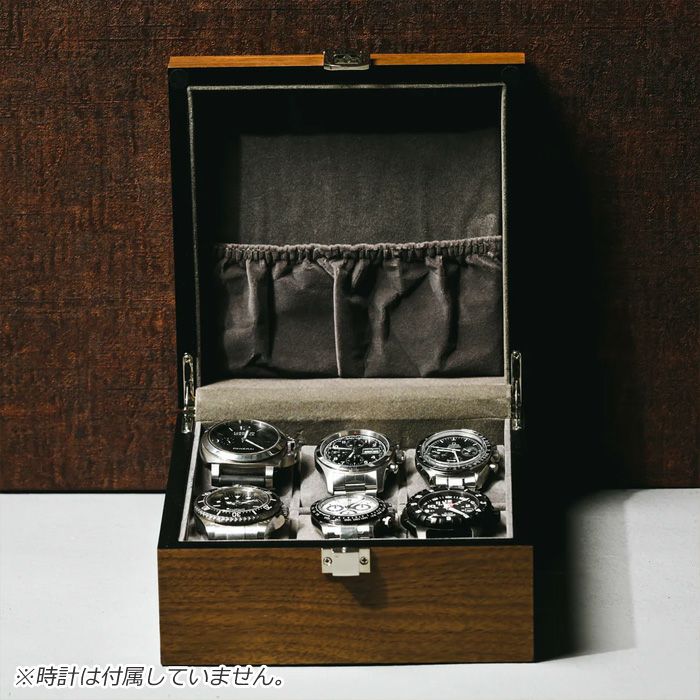 ■高品質のクルミの木素材を使用した6本用時計ボックスは、エレガントで洗練されたデザインが魅力です。