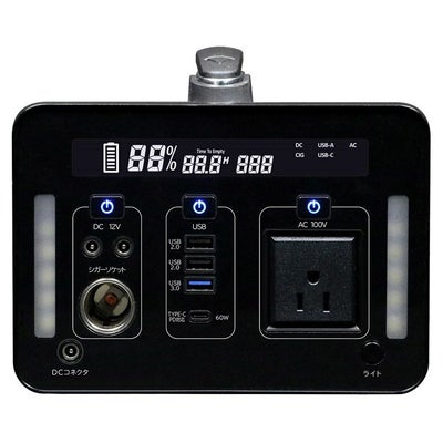 ■アウトドアやレジャー、災害などの困ったときにまで。使い方いろいろで便利、そして安心■DC出力、AC出力、USB出力〔USB2.0、QC3.0、TYPE-C(PD対応)〕により、幅広い機器、家電へ充電することができます■災害時にも便利なライト付き■別売りのソーラーパネルで充電可能■外径寸法(mm):幅200×奥行き294×高さ146■質量:約10.0kg■充電池:リチウムイオン充電池■充電時間:家庭用100V11~12時間、車載用12V10時間、ソーラーパネル(別売)100W32時間/160W20時間■充電池容量:1085.76Wh/301600mAh■AC出力:AC100V 1000W 50/60Hz(※要切替 純正弦波)■DC出力:DC12V 5A×2、車載12V 10A■USB出力:USB2.0×2、QC3.0(最大18W)、Type-C PD対応(MAX60W)