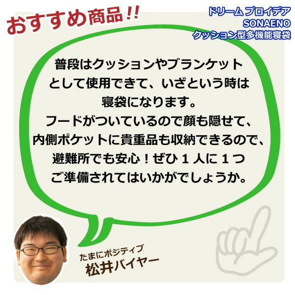 他の画像を見る 送料無料・代引き手数料無料 【マツコの知らない世界で紹介!】ドリーム プロイデア SONAENO クッション型多機能寝袋 D-0070-4060-00 オリーブグリーン 当店特別価格 ¥ 11,180 税込 送料無料・代引き手数料無料 カートに入れる お気に入りに登録する