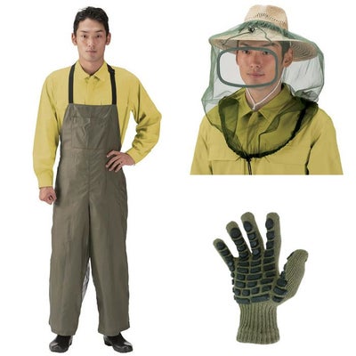 草刈りサロペット:ポリエステル100%(撥水加工)、メッシュ:ポリエステル100%(防蚊加工)