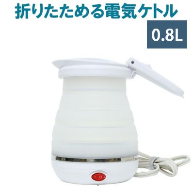■コンパクトサイズに折りたためるボディ本体は柔らかいシリコン製。軽い力で簡単にコンパクトに折りたたむことが出来る電気ケトルです。邪魔になりがちな取っ手部分も本体内に収納することが可能。旅行へ携行する際や、ご自宅で収納場所がない場合などに便利にお使いいただけます。■容量800mlでお湯をたっぷり沸かせる一度に沸かせるお湯の量は最大800ml。お友達やご家族の分など、2~3人分に必要なお湯を一気に沸かせます。カップ麺やコーヒーはもちろん、湯量を必要とするカップ焼きそばや、どんぶり型インスタントラーメンもお楽しみいただけます。<湯量800mlの目安>カップ麺:約2~3杯分どんぶり形カップ麺:約2杯分コーヒー:約5~6杯分育児ミルク:約5~6本分■普段使いから海外旅行まで「Myケトル」を携行可能本体底面には電圧切替スイッチを搭載。現地の対応電圧に切り替え、海外でも安全にご使用いただくことが可能です。※渡航先によっては電源変換アダプタ(別売)が必要になる場合があります。■スピーディーに沸騰本体内側には大きなヒートパネルを設置。たっぷりのお湯をすばやく沸騰させることが可能です。200mlなら約3分~、800mlなら約9分~で沸騰します。※上記沸騰時間は目安です。水温や気温など、ご使用環境により大きく前後する可能性があります。■自動保温機能搭載お湯の温度が約85℃まで下がると、自動で再沸騰する保温機能を搭載しています。(※ご使用後保温の必要がない場合は、必ず電源をOFFにするか電源ケーブルを抜いてください)■電源:AC100~127V/220~240V 50/60Hz■消費電力:AC100~127V:570~920W/220~240V:680~820W■電源コード:約1m(コンセント Aプラグ)■沸騰時間(100V時):800ml:約9分~10分 / 200ml:約3分~4分 / ※上記沸騰時間は目安です。水温や気温など、ご使用環境により大きく前後する可能性があります。■サイズ:使用時:約W196×D130×H180mm / 収納時:約W135×D130×H98mm■重量:約608g(本体のみ)■容量:最大800ml■材質:ステンレス、シリコン、PPほか■保証期間:お買い上げ日より1年間