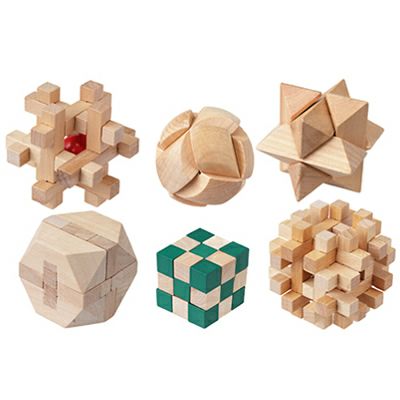 ■木製パズル6種類セット。木のぬくもりに触れながらスマホやパソコンに疲れた頭をやわらかくほぐして、リラックスさせてくれるパズル。初級2個、中級2個、上級2個の6個セット。■材質:荷木■梱包サイズ/重量:W23×D34.5×H8.2cm/1090g