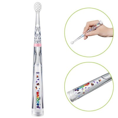 持ち手部分は虹色のラメがフローティングするユニークなデザイン。ウサギ型のラメを探して、歯磨きのやる気もUPします!