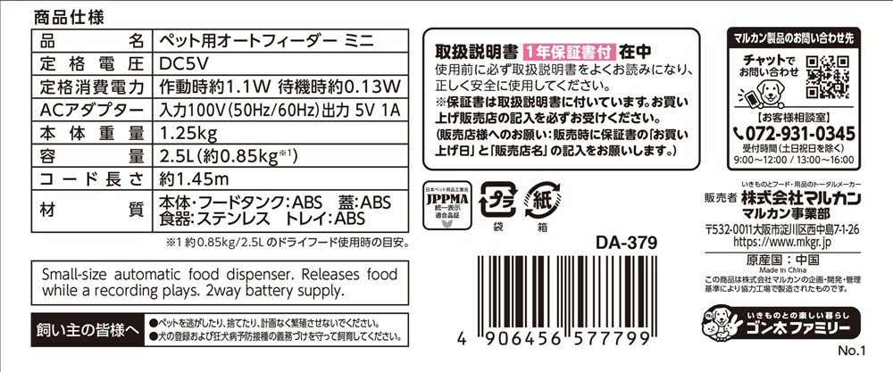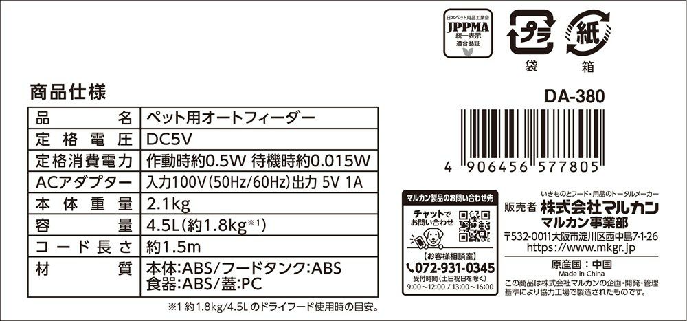他の画像を見る 送料無料 マルカン ペット用 オートフィーダー GONTA CLUB/NYANTA CLUB DA-380 犬猫用品 当店特別価格 ¥ 13,980 税込 送料無料 カートに入れる お気に入りに登録する
