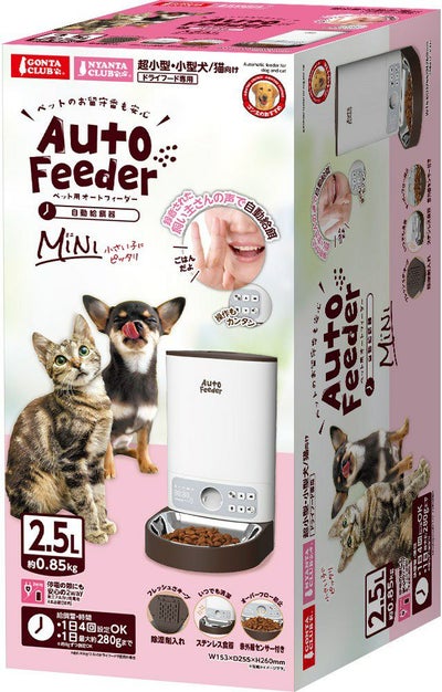 ■ペットのお留守番も安心!ペット用オートフィーダーです。■録音された飼い主さんの声で自動給餌できる!■タンク容量2.5L(約0.85kg)■除湿剤入れ付きでフレッシュさキープ。■ステンレス食器なので水洗い可能。いつでも清潔。■赤外線センサー付きでフードのオーバーフロー防止。■停電の際にも安心の、電源コードと電池の2way給電(単三アルカリ乾電池4本必要(別売))。■給餌量・時間らくらく設定・1日最大約280gまで給餌可能。※本品は体積で計量しているため、フードの形状や密度によりグラム数は変動します。グラム数は目安となりますのでご了承ください。■1日最大4回給餌時間設定可能。■1回約8g~72gまで給餌量設定可能。※約8gずつ設定できます。■決めた時間に決めた量を与えることで体重管理もらくらく。■大粒タイプや粒の一辺が5mm以下または12mm以上のドライフードはご使用できません。■半生、セミモイストタイプ、また缶詰などウェットタイプのフードはご使用できません。(ウェット・半生・セミモイストタイプのフードを入れると故障の原因となります。)■材質:本体・フードタンク/ABS、蓋/ABS、食器/ステンレス、トレイ/ABS■本体サイズ:W153×D255×H260mm■適応種:超小型犬、小型犬、猫■定格電圧:DC5V■定格消費電力:作動時約1.1W 待機時約0.13W■ACアダプター:入力100V(50Hz/60Hz) 出力5V 1A■原産国または製造地:中国