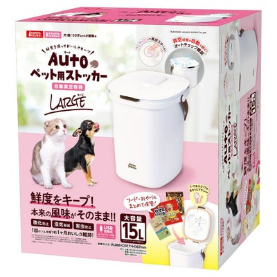 ■真空状態でフードやおやつをまとめて保管できる大容量のストッカーです。■大容量15Lなので、フードやおやつを袋ごとまとめて保管することができます。■真空機能に加え、遮光性があるストッカーなので光るの影響が少なく、フードやおやつの酸化を防ぐため新鮮さをキープできます。■ボタンを押すだけで、簡単に真空状態にできます。■真空状態がゆるくなったらオートチェック機能が作動し、自動で真空状態をキープします。■真空装置は本体から取り外して充電。1回フル充電で約1ヶ月おいしさをキープ!■材質:本体/ABS・PC・シリコン■本体サイズ:W288×D317×H367mm■内寸:上面W235×D260mm/底面W210×D235mm/高さ300mm■本体重量:約2.5kg■定格電圧:DC5V■ACアダプター:入力100-240V(50/60Hz)/0.6A、出力DC5V/1A■内蔵電池:リチウムイオン電池(3.7V)■電池容量:2600mAh■充電時間:約5時間■定格消費電力:作動時約2.1W 待機時約1.4W■セット内容:本体、真空装置(本体にセット済み)、フード用スコップ、おそうじブラシ、ACアダプター(真空装置充電用)■原産国または製造地:中国