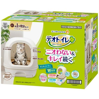 ■シートは銀イオン配合。ニオイ菌99.9%抑制!1週間分のオシッコをパワフル吸収!サンドとミクロの穴でニオイを吸着。■足元にオシッコを残さない構造で、キレイな排泄スペースをキープ。消臭抗菌サンドは99.9%抗菌で清潔。■シートは週1回、サンドは月1回の交換をするだけでOK。■お手入れが簡単なのに、ゴミの量も51%削減。■前後入れ替え可能で、同じ場所でオシッコするネコちゃんも無駄なく使えます■お手入れしやすいスライドオープンフード。■オシッコの色が確認しやすい白色シート。■サンドの飛び散り防止設計。■排泄スペースが広くなり、ゆったり快適。■材質:猫の室内用トイレ/ポリプロピレン、猫の室内トイレ用砂/ゼオライト・シリカゲル、猫の室内トイレ用シート/ポリオレフィン・ポリエステル不織布・綿状パルプ・吸水紙・高分子吸水材・ポリエチレンフィルム・抗菌剤・ホットメルト接着剤・香料入り消臭マイクロカプセル■デオトイレ本体サイズ:約幅42×高さ43(一番高いところ)×奥行54cm■セット内容:トイレ本体、消臭抗菌サンド2L、消臭抗菌シート4枚