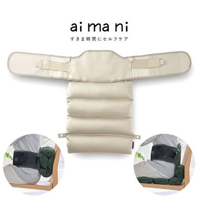 すきま時間にセルフケア「aimani」は「すきま時間にセルフケア」をコンセプトに、忙しい日々の“合間に”寄り添うシリーズです。オフィス・ご家庭を問わず、インテリアに馴染むナチュラルなカラーです。■クッションの形を変えて選べる2通りのケアクッションを丸めてスナップボタンで留め、背もたれと腰の隙間をクッションが支えることでいい姿勢を保ちやすい「ランバーサポートスタイル」。広げたクッションをイスの座面に敷いて坐骨を守る「座面クッションスタイル」。お悩みに合わせた2通りのケアに対応しています。■ファスナーで取り外し可能なクッションクッション部分とコルセット部分はファスナーで取り外しが可能。コルセットとクッションを分離させてそれぞれで使用することができます。また、体にふれるコルセット部分は手洗いができるため、長く清潔にお使いいただけます。■外形寸法:約350(W)×140(D)×200(H)mm(個装箱収納時)■質量:約340g■主な材質:コルセット本体:ナイロン、ポリエステル、ポリウレタン 調整ベルト本体ゴム:ポリエステル、ポリウレタン 本体面ファスナー(メス):ポリエステル 腰サポートプレート:ポリプロピレン クッション生地:ナイロン、ポリウレタン クッション中材:発泡ポリスチレン■サイズ:M(腰まわり約75~90cm)【ご使用上の注意】本製品は医療機器ではありません。疾病の治療目的では使用しないでください。本体が汚れた際はクッションを取り外し、コルセットのみ洗濯してください。クッションは洗濯できません。色の薄いものと一緒に洗濯しないでください。色落ちや色移りのおそれがあります。本体を洗濯する際は、面ファスナーを本体にとめてください。面ファスナーのつきが悪くなったり、他のものについて、ほつれや伝線の原因になることがあります。コルセットを洗濯する際は、水と洗濯用合成洗剤などでていねいに押し洗いし、絞らないように水気を取ってください。乾燥機での乾燥やドライクリーニングは避け、日陰で吊り干しにしてください。塩素系漂白剤や柔軟剤、アイロンは使用しないでください。製品をいためる原因になります。直接日光の当たる場所や、高温・多湿の場所での使用または保管はしないでください。商品の見直しなどのため、仕様・価格・デザインその他は予告なく変更する場合があります。商品の色は実際の色とは異なって見えることがあります。