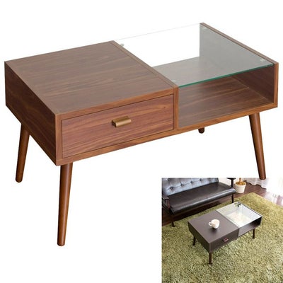 ■半分がキレイなガラス天板+お気に入りの雑貨を魅せる収納スペース、もう半分は木製天板+引き出しとなっております。