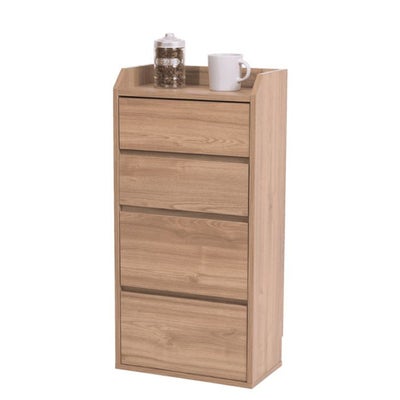■カウンター下やリビングの窓下など、部屋のデッドスペースを有効利用できる家具シリーズ。■リビングやキッチンで収納に困るちょっとした物を収納可能なチェスト■[外寸]:幅40×奥行22×高さ80cm(金具小使用時)高さ82.5~90cm(金具大使用時)高さ90~97.5cm■その他サイズ:[内寸](上オープン部)幅36.5×奥行20×高さ5cm(引出し)幅32.5×奥行16×高さ 1段目:9 / 2段目:8 / 3段目:13 / 4段目:13.0cm■材質:[本体]低圧メラミン化粧繊維板■収納量・耐荷重:[天板]約15kg以下[引出し小]約7kg以下[引出し大]約10kg以下■備考:・突っ張り金具2種類付属・幅木避け付き・背面化粧あり■組立時間(目安)(大人2人):お客様組立(30分)