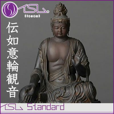 ■凛々しい眼差しと実物に迫る量感を表現するため、原型製作に180日を費やす。 透明感さえ感じさせる木肌を丁寧な彩色で甦らせる。緻密に造りこまれた四天王が支える台座は、金箔23枚を貼り込んだうえに古色仕上げを施し、渋い輝きを放つ。 ■持統天皇が夢のお告げを受けて建立した伝承を持つ、京都・宝菩提院願徳寺の本尊、国宝「菩薩半跏像」を再現。寺伝では如意輪観音として伝わる。切れ長で涼しげな眼もとや流れるような衣文の表現に異国の雰囲気が感じられ、神秘的な美しさが印象的。蓮華座に観音を支える四天王が配置された精緻なつくりとなっている。平安初期の一木造りにおける最高傑作のひとつ。■サイズ:約275(H)×155(W)×155(D)mm 1.7kg■素材:ポリストーン