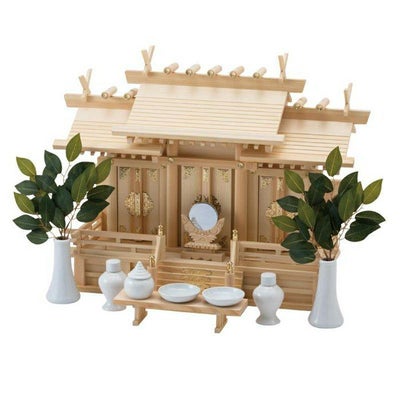 ■セット内容:本金具屋根違い三社(中)・神具(中)7点セット・神鏡2寸・八足台・榊造花2枚