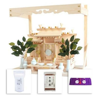 ■セット内容 神具セット小、八足台、榊造花小、神鏡2寸、神棚板中、清めの塩500g、古代米赤米、神前幕
