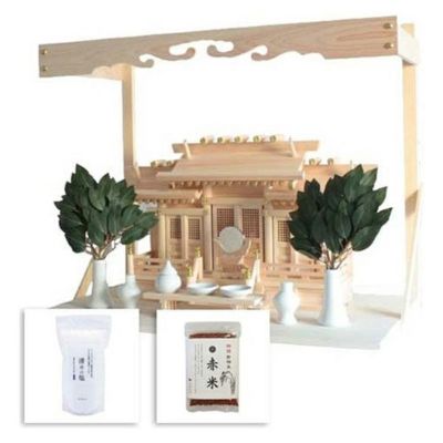 ■セット内容 神具セット小、八足台、特上榊造花、神鏡2寸、神棚板中、清めの塩500g、古代米赤米