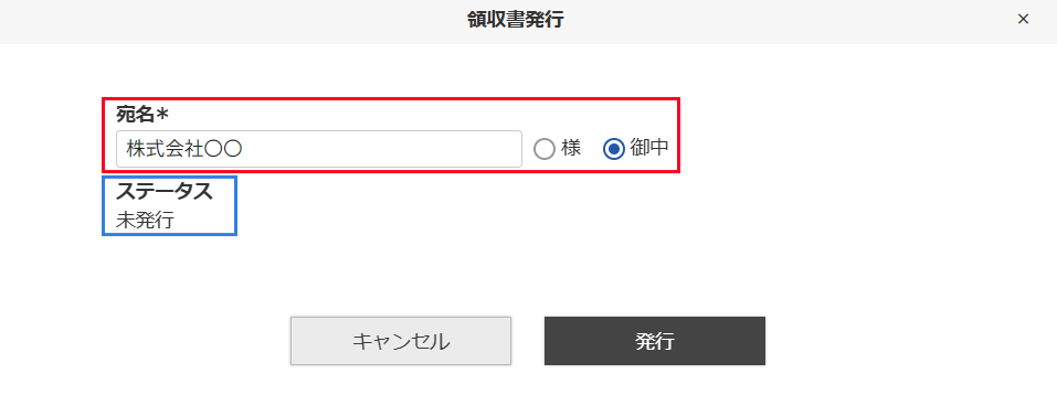 [領収書を発行する]ボタンを押下すると、領収書発行に必要な出力項目を入力する「領収書発行」画面が表示されます。