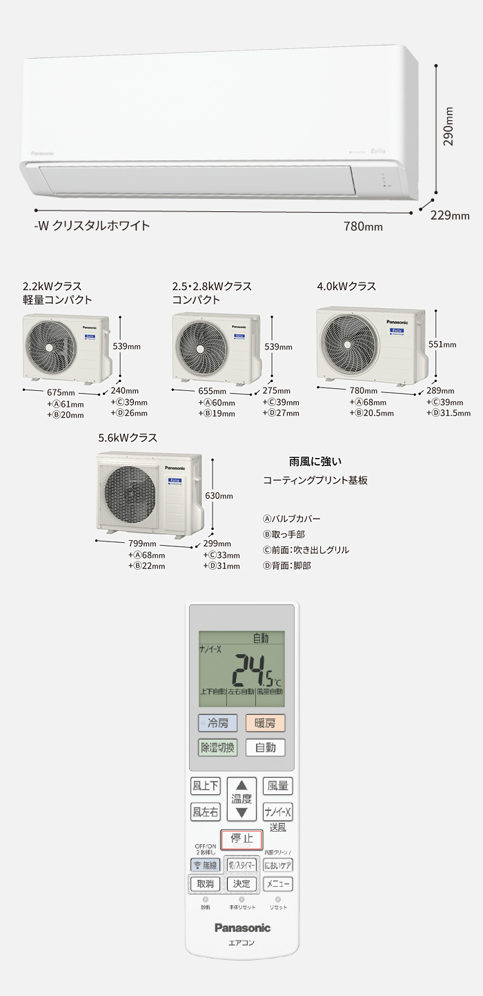 ■外形寸法(高さ×幅×奥行):室内機 290×780×229mm/室外機:630×799×299mm※ 室外機寸法には、バルブカバー部、グリル部、脚部などの寸法が含まれていません。 実際の寸法についてはカタログ等でのご確認をお願いいたします。